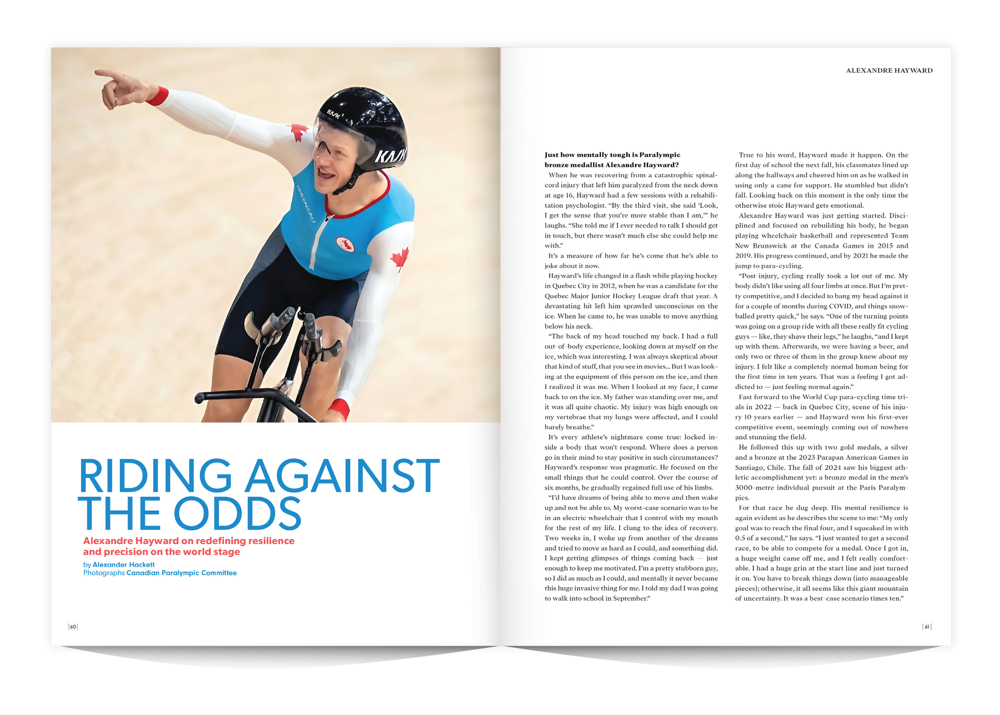 In this issue, you will meet Kristi Roach, who is redefining what it means to belong in the world of golf. You step into the ring with the fighters who are shaping a new era of combat sports in Atlantic Canada, and you hear from Alexandre Hayward, whose story speaks to the power of resilience and self-belief. SailGP sets sail again in Halifax, Nova Scotia.